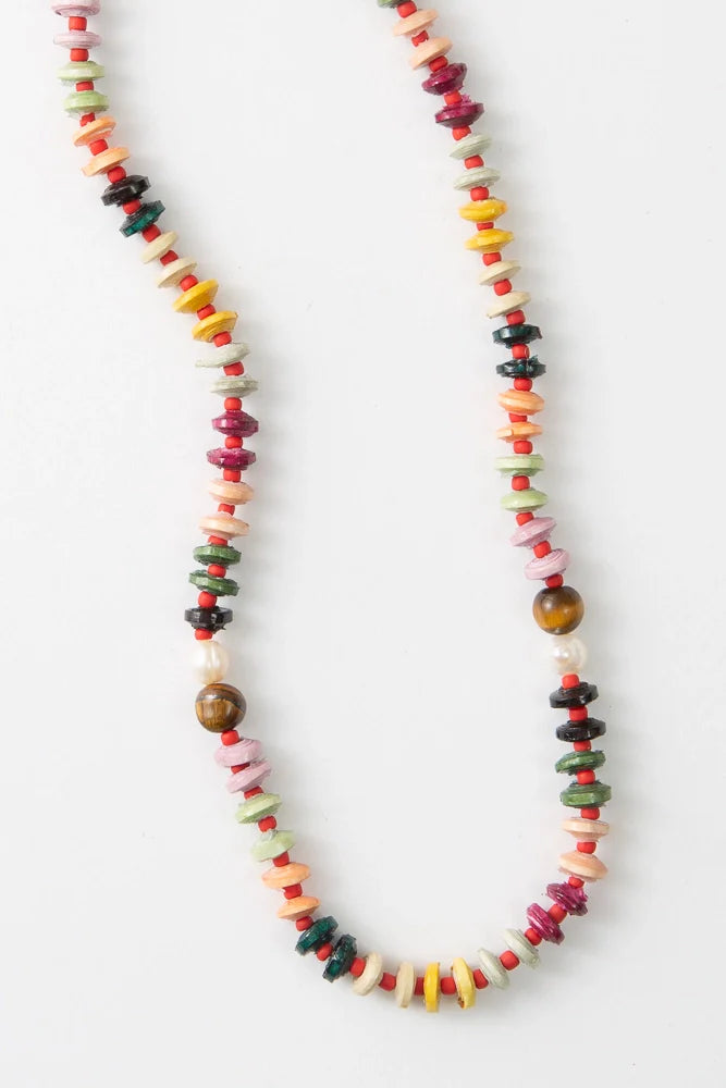 Handcrafted paper beads meet natural stone in this artisanal necklace, layered with lustrous glass and tiger's eye for depth and movement. Freshwater pearls add subtle elegance, while the gold-plated copper closure ensures a refined finish. Each piece celebrates traditional beadwork with modern sensibility—a statement accessory that bridges craftsmanship and contemporary style.