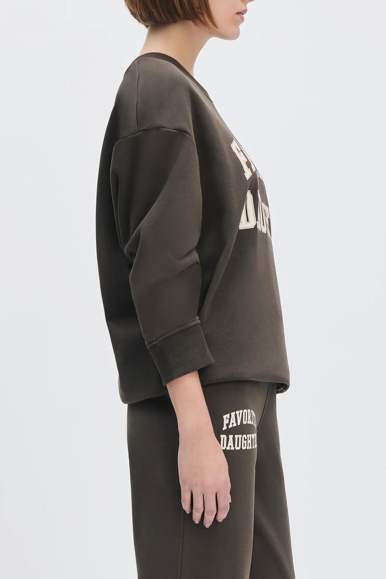 Model wearing the coffee gardenia collegiate sweatshirt