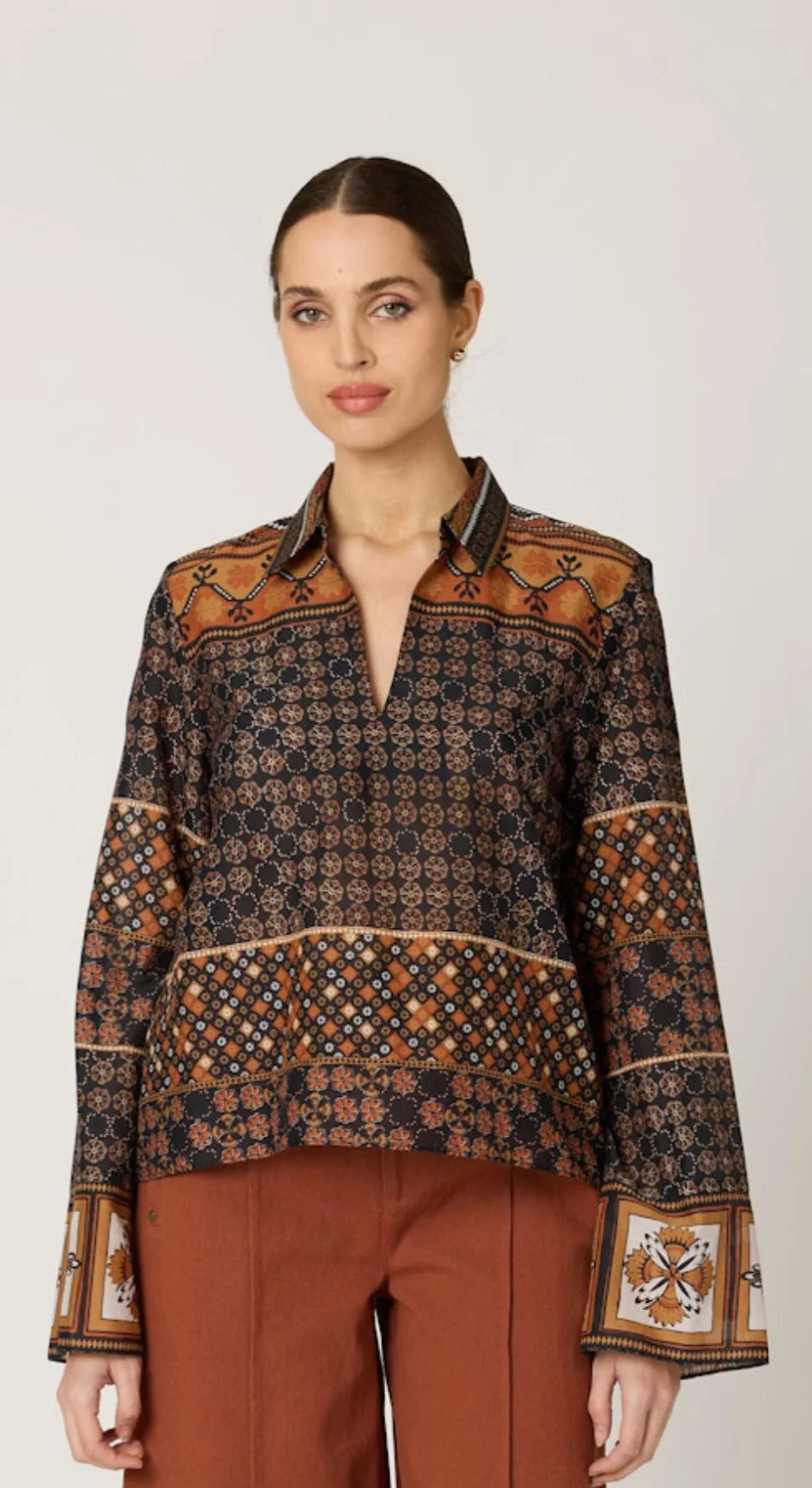 The Moira Blouse blends artisanal detail with effortless polish. Featuring a rich geometric print in warm amber and deep espresso tones, this woven blouse stands out with its relaxed silhouette, split neckline, and dramatic cuffed sleeves. Its intricate pattern and tailored cut make it an easy statement piece — perfect for pairing with trousers, denim, or skirts.