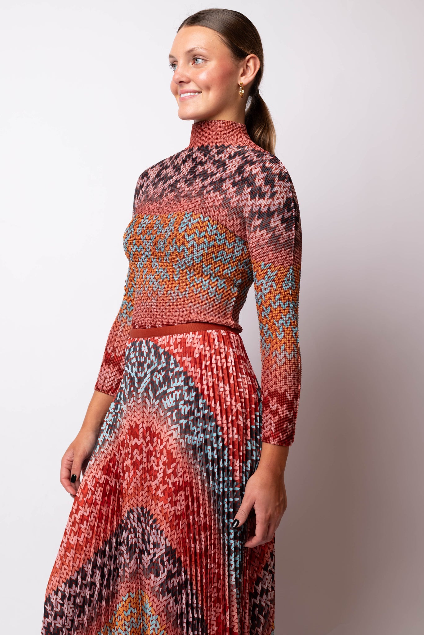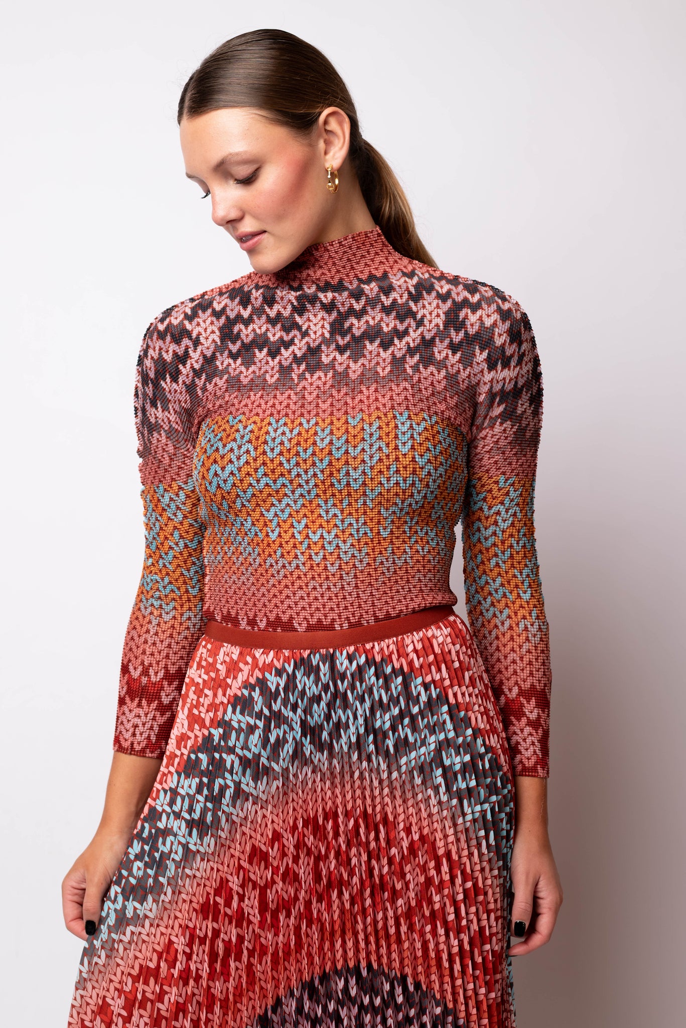 Introducing the Sienna Top—a warm red stunner with an intricate Bohemian pattern that feels both laid-back and put-together. The 3D Honeycomb Texture adds subtle dimension while gently sculpting your frame for a flattering fit. Throw it on with the matching Sienna Pleated Skirt and you've got that effortless seasonal vibe locked down. No fuss, just timeless style.