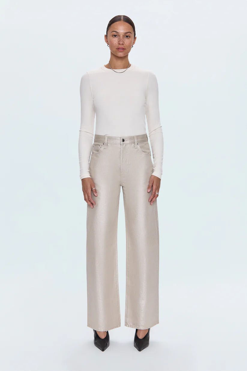 A signature shape, Tate features a high rise, bowed wide leg, and full-length 32" inseam that creates elegant movement and modern proportion. Crafted from 100% cotton non-stretch denim in Champagne Luster, a pearly coated finish that reflects light with every step for an effortlessly elevated look.