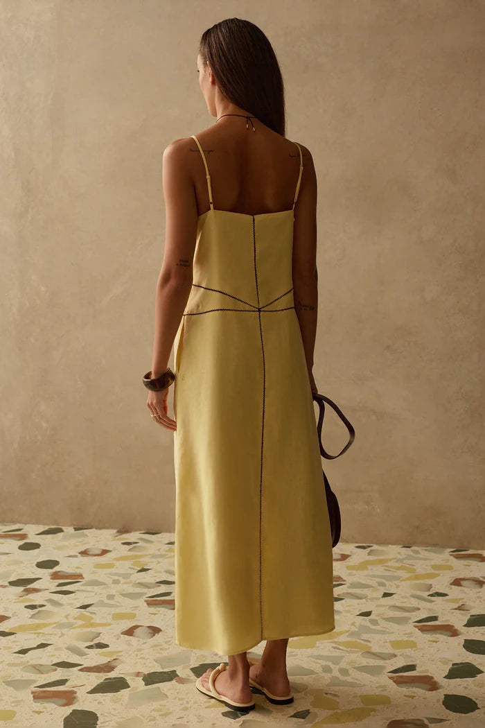 The Daniela Dress is a maxi that doesn't take itself too seriously. V-neckline with contrast stitching catches the light, while adjustable straps let you dial in the fit. Centre split and side seam zipper keep things practical—easy on, easy off. Wear it dressed up or throw it on with sneakers. Either way, you've got a piece that works.