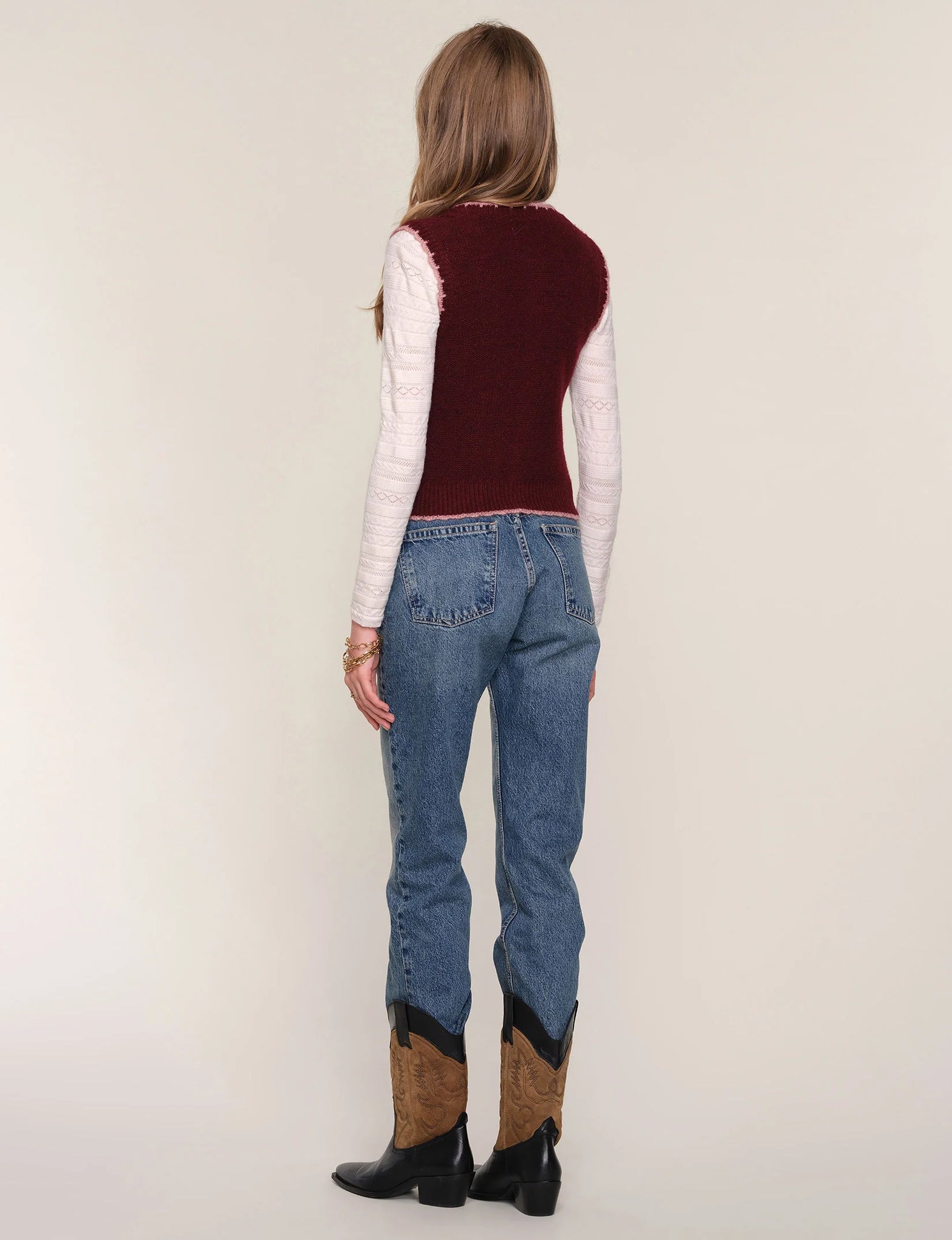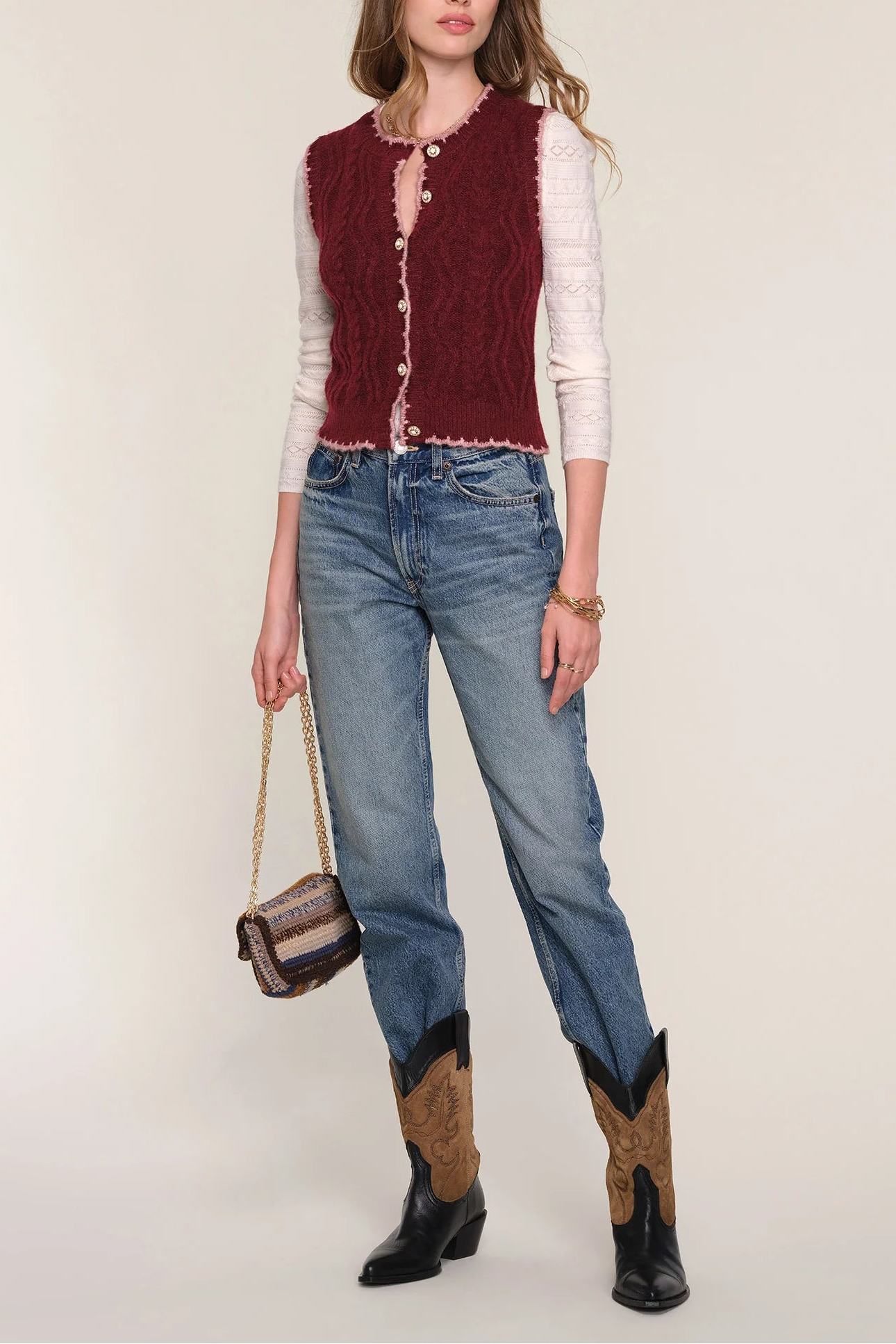 The Turner Vest is a super soft, cable stitch vest. It features a crew neck, and relaxed fit. It has a pretty, contrast tipped edge and novelty buttons.