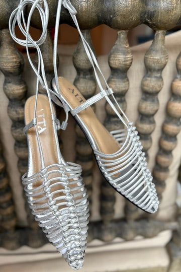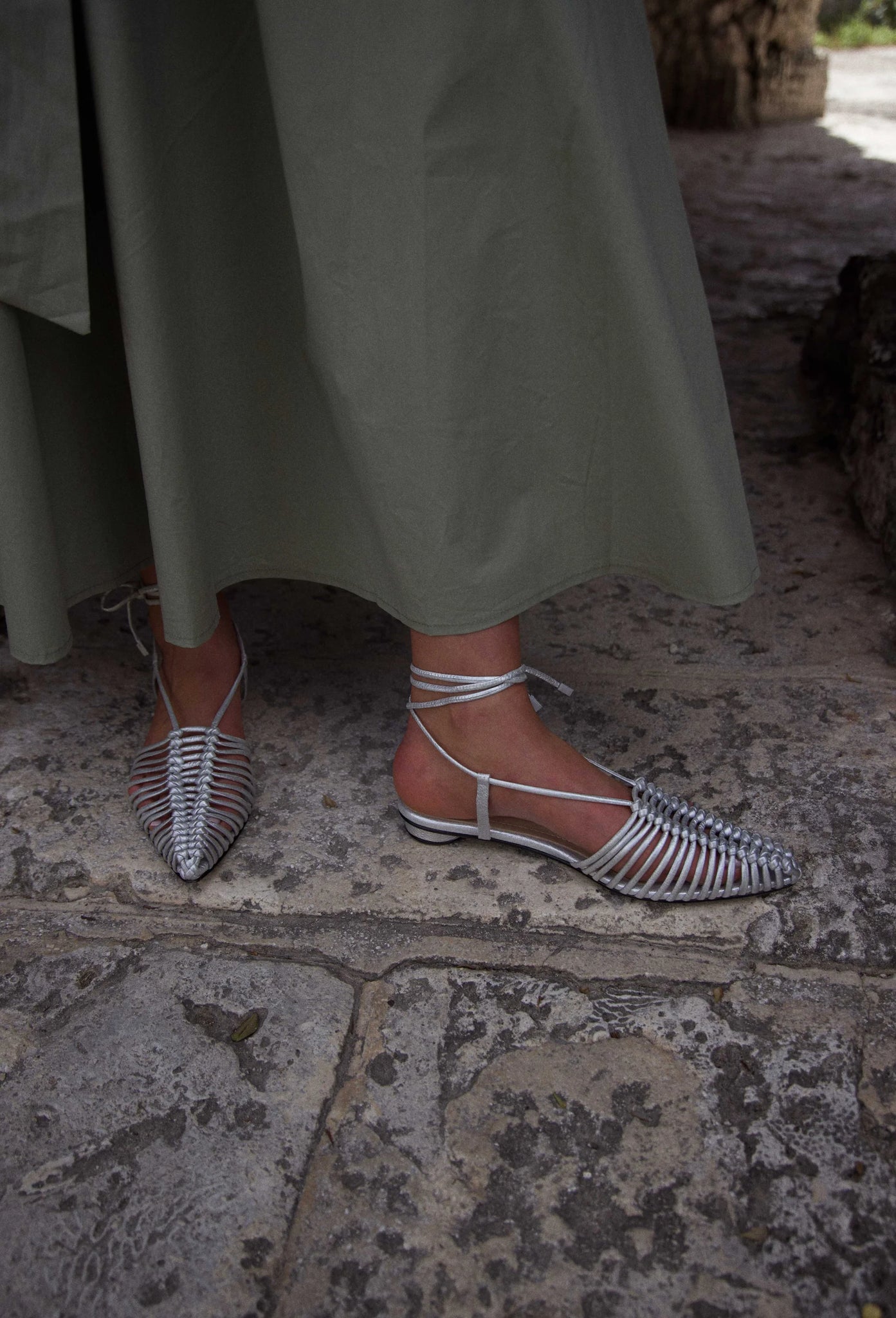 Features: Lace-up ankle tie, handwoven leather cording, closed pointed toe