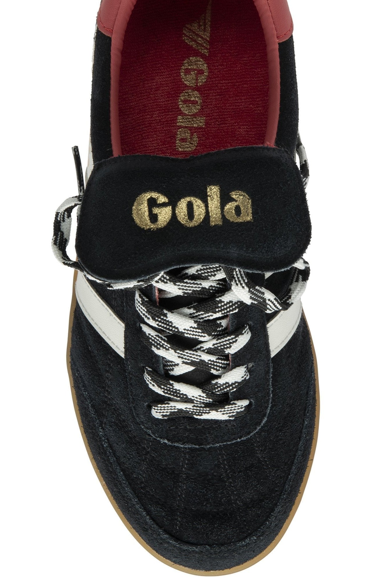 The women’s Stadia ‘86 references Gola’s heritage with a vintage football silhouette and a gum cup sole, black suede upper and check laces. A signature off white wingflash trim and coral tab are complimented with a fold over tongue in this new AW women’s sneaker from Gola.