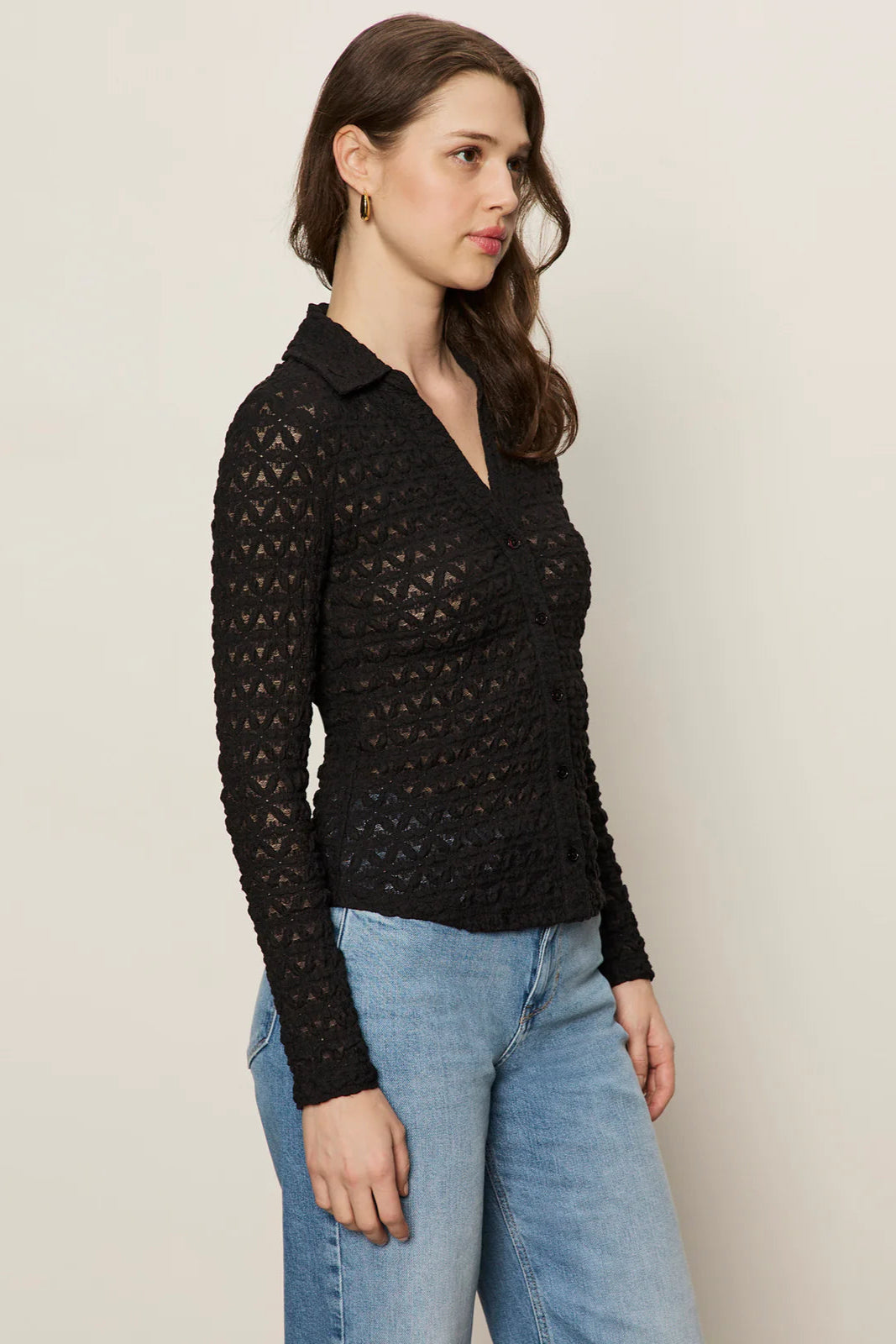 A chic twist on a timeless classic, the Dreamgirl Lace Button Up combines elegance with versatility. Designed with a spread collar and front buttons, its fitted shape flatters while the sheer lace fabric adds a touch of allure. Perfect for pairing with denim for a casual look or layered over a bralette for a night out, this top is your go-to piece for effortlessly chic styling.