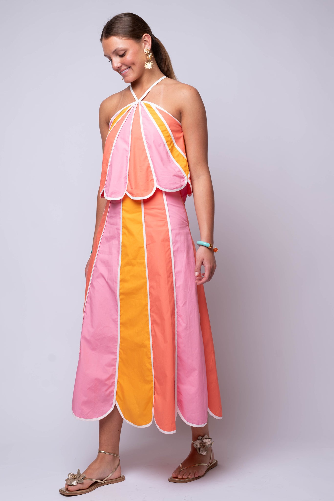 Sunset-inspired stripes meet playful scallop details in this statement halter top. Featuring vibrant colorblock panels with crisp white piping and a button closure at the back, this piece brings effortless summer style to any look.