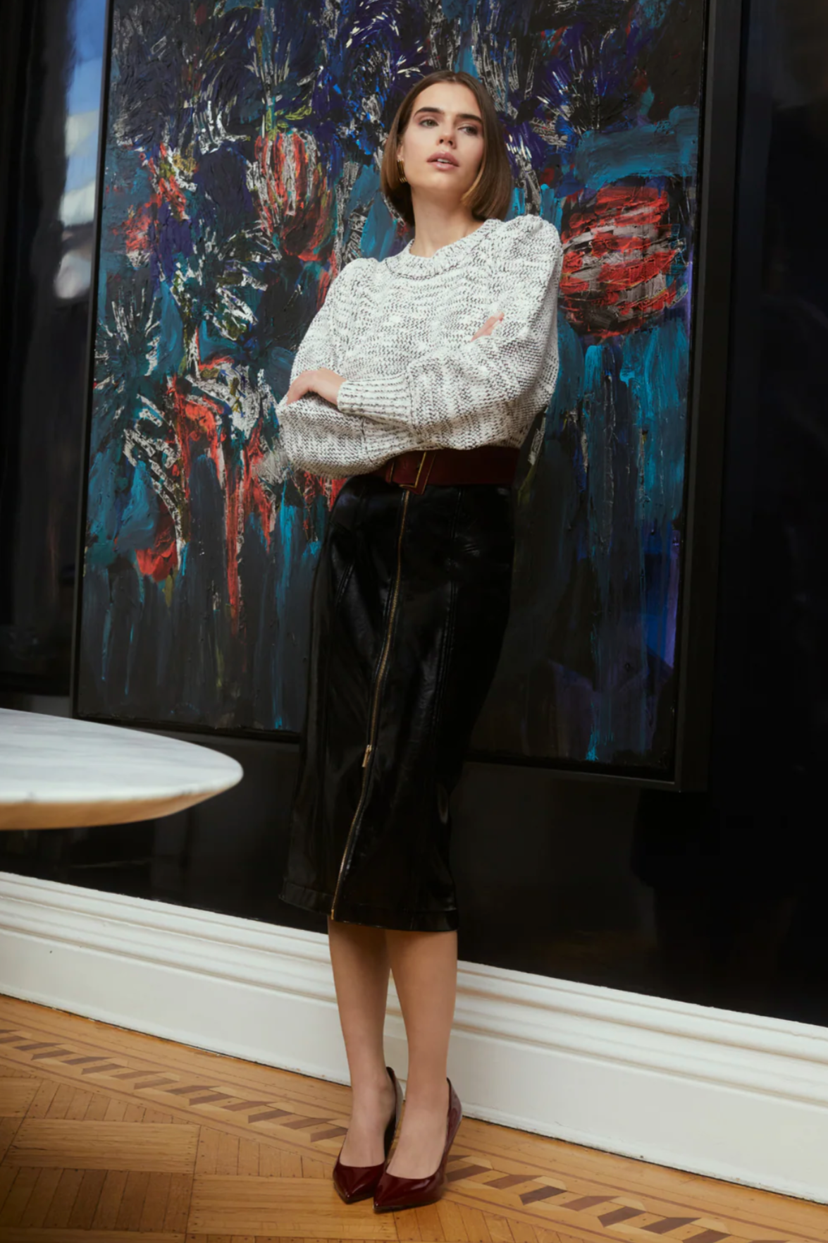 The Taren Skirt is sleek, sculpted, and ready for a night out. Fitted through the hips with a flattering 2-way center front zipper, this edgy faux leather piece is all about modern polish. Hits below the knee with a strong silhouette and easy movement.