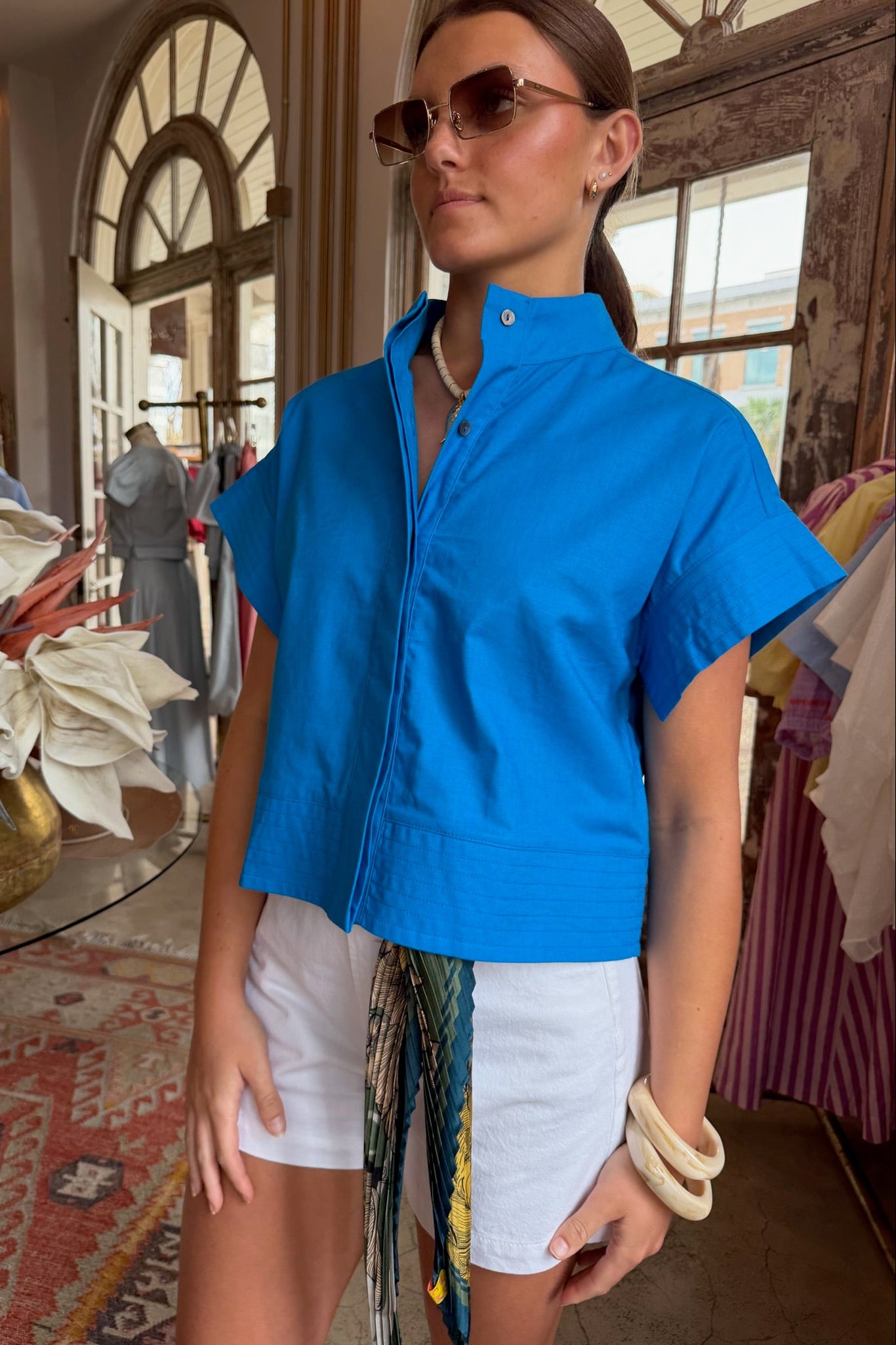 An effortless boxy button-up top by Bandit and the Babe designed for easy, everyday styling. The Harper Body features a modern cropped silhouette with short sleeves and a clean, collarless neckline. Lightweight and breathable, it's the kind of piece you'll reach for all season long.