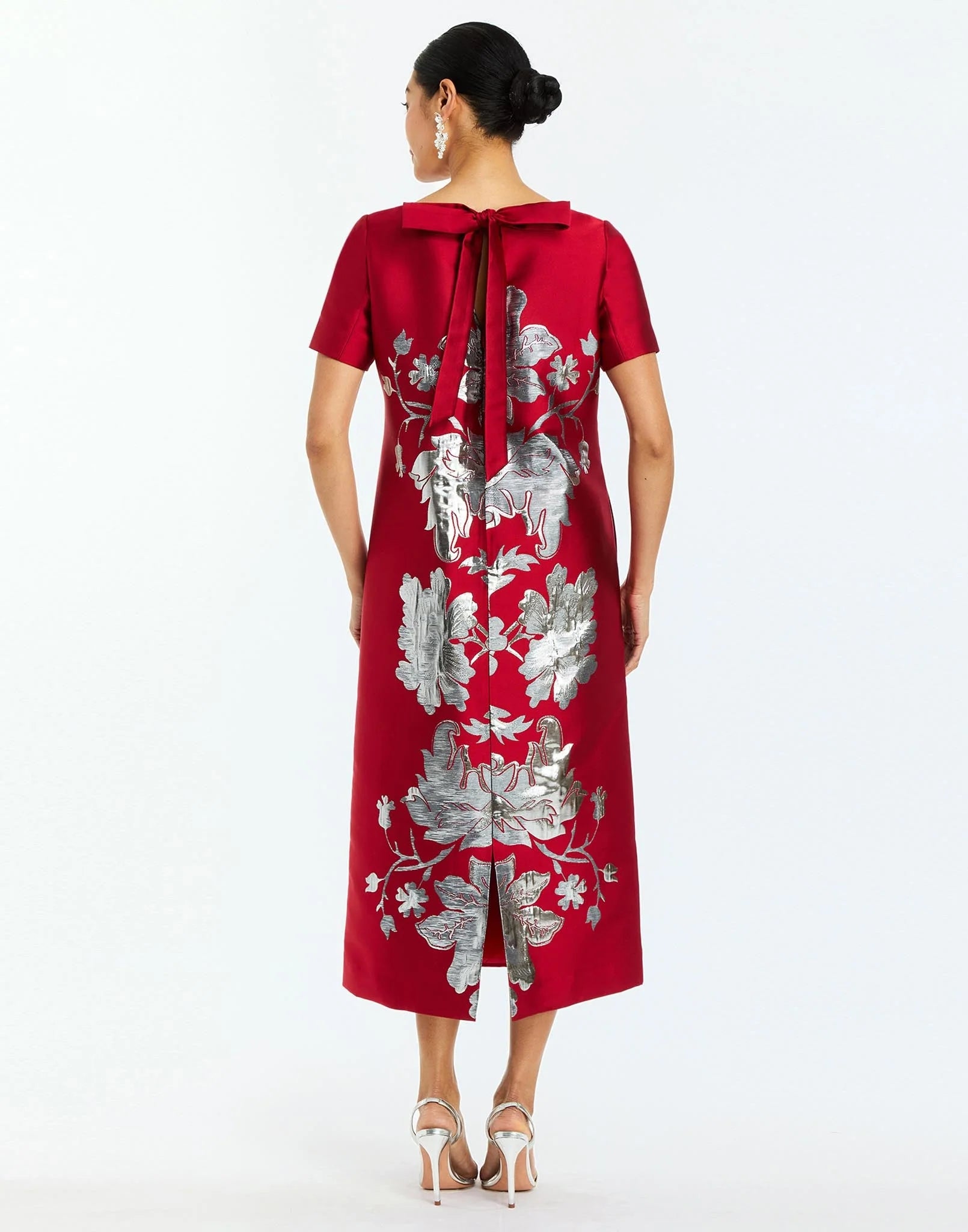 The Adria Midi Dress in Burgundy Arbor is a timeless cocktail silhouette reimagined in lustrous metallic jacquard. Designed with a refined column shape and finished with elegant details like a boat neckline, short fitted sleeves, and a dramatic bow-tied back keyhole, this piece exudes sophistication.