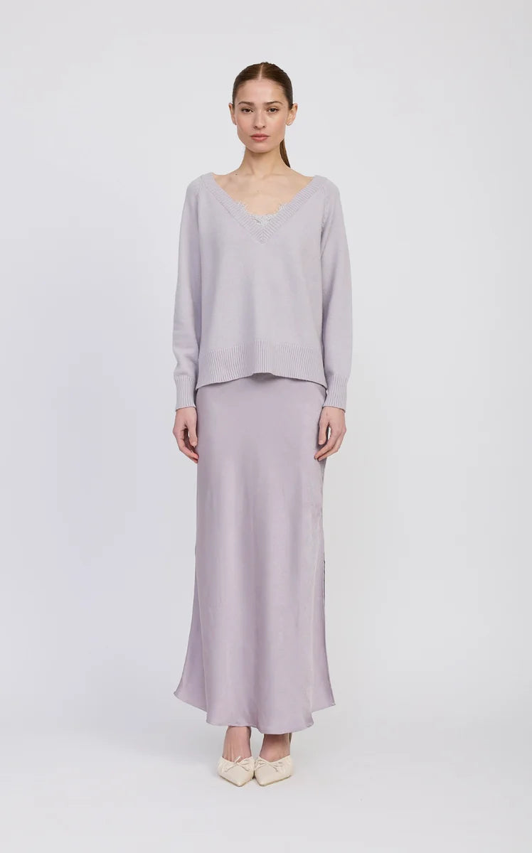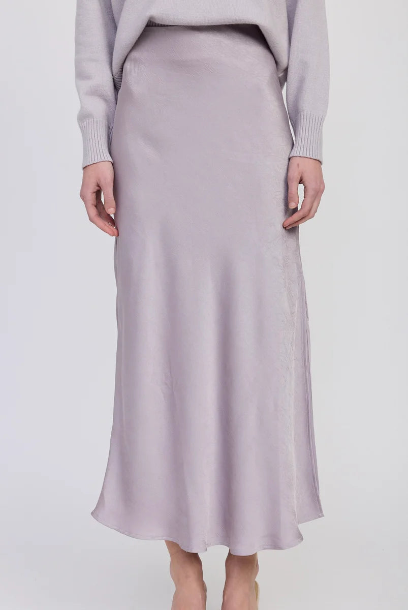 The Aracella Maxi Skirt in soft lavender satin effortlessly drapes over your curves thanks to its playful bias cut. A daring side slit adds just the right amount of flirty movement, making it easy to twirl through warm evenings or casually upgrade your everyday look with a silky-smooth finish.