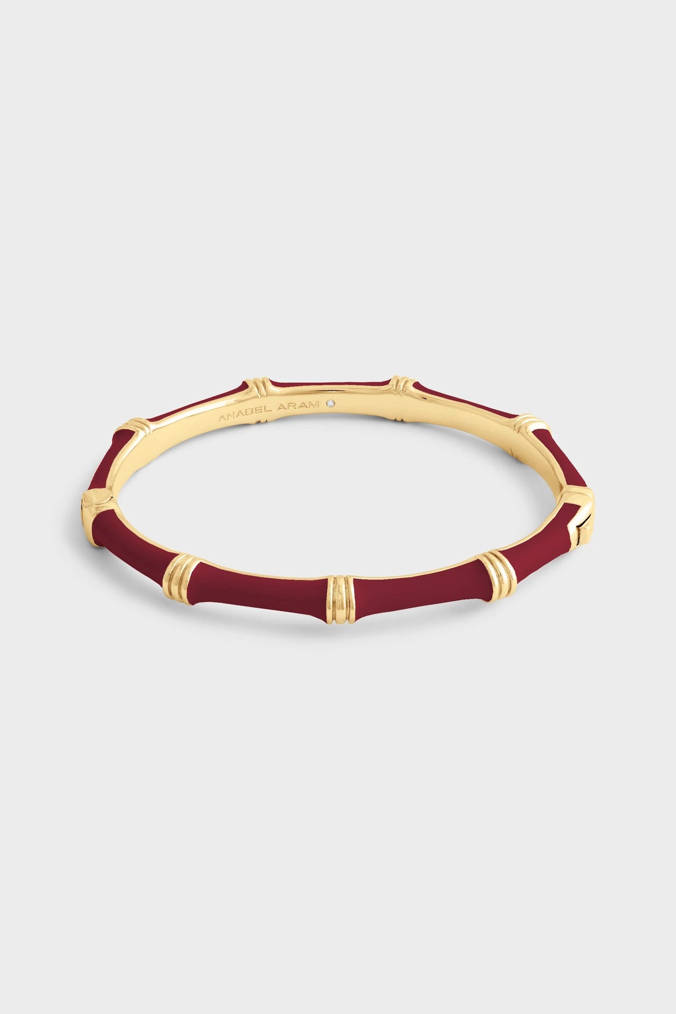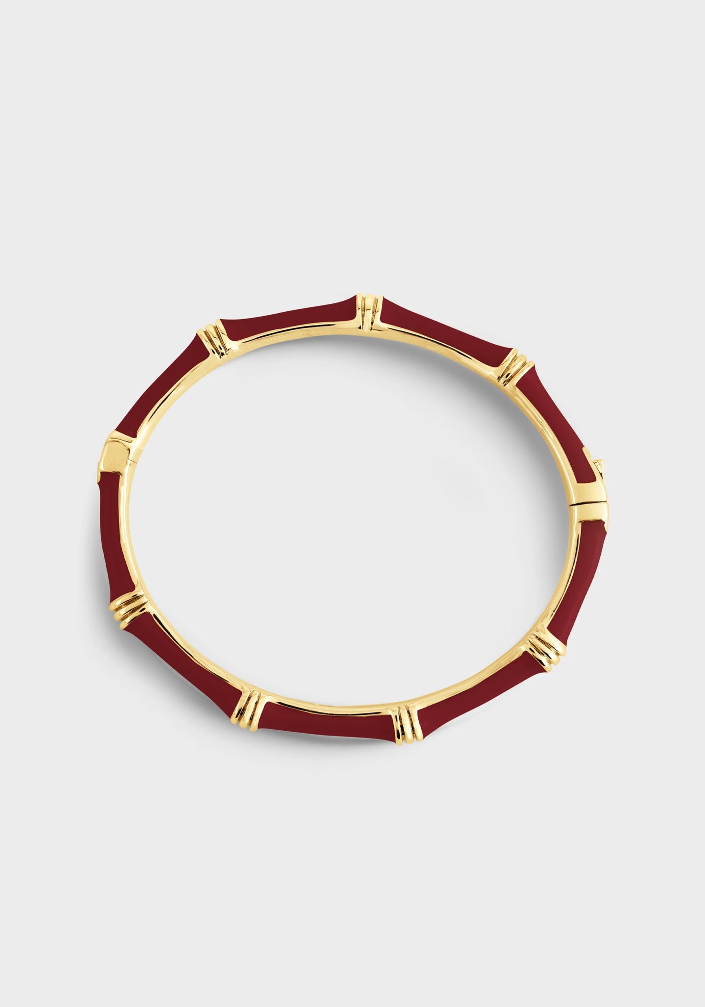 Elevate your everyday looks with the radiant allure of this bamboo hinged bangle, now in 4 new beautiful hand painted enamel colors. Crafted from sumptuous 18k gold-dipped brass, the bangle is sculpted to perfection, adorned with sparkling crystals that catch the light with every movement. Its secure hidden clasp, reminiscent of the finest jewelry craftsmanship, ensures both elegance and ease of wear, making it a refined accessory for any occasion. In the realm of accessories, this bamboo hinged bangle stands out as an exceptional piece of artistry. The intricacy of the sculpted design and the shimmering crystals culminate in a perfect union of glamour and versatility. The hidden clasp adds an element of mystery and refinement, making this bangle a stunning addition to your collection. Whether paired with casual or formal attire, it promises to be the perfect touch of sophistication, adding a radiant sparkle to your daily ensembles.