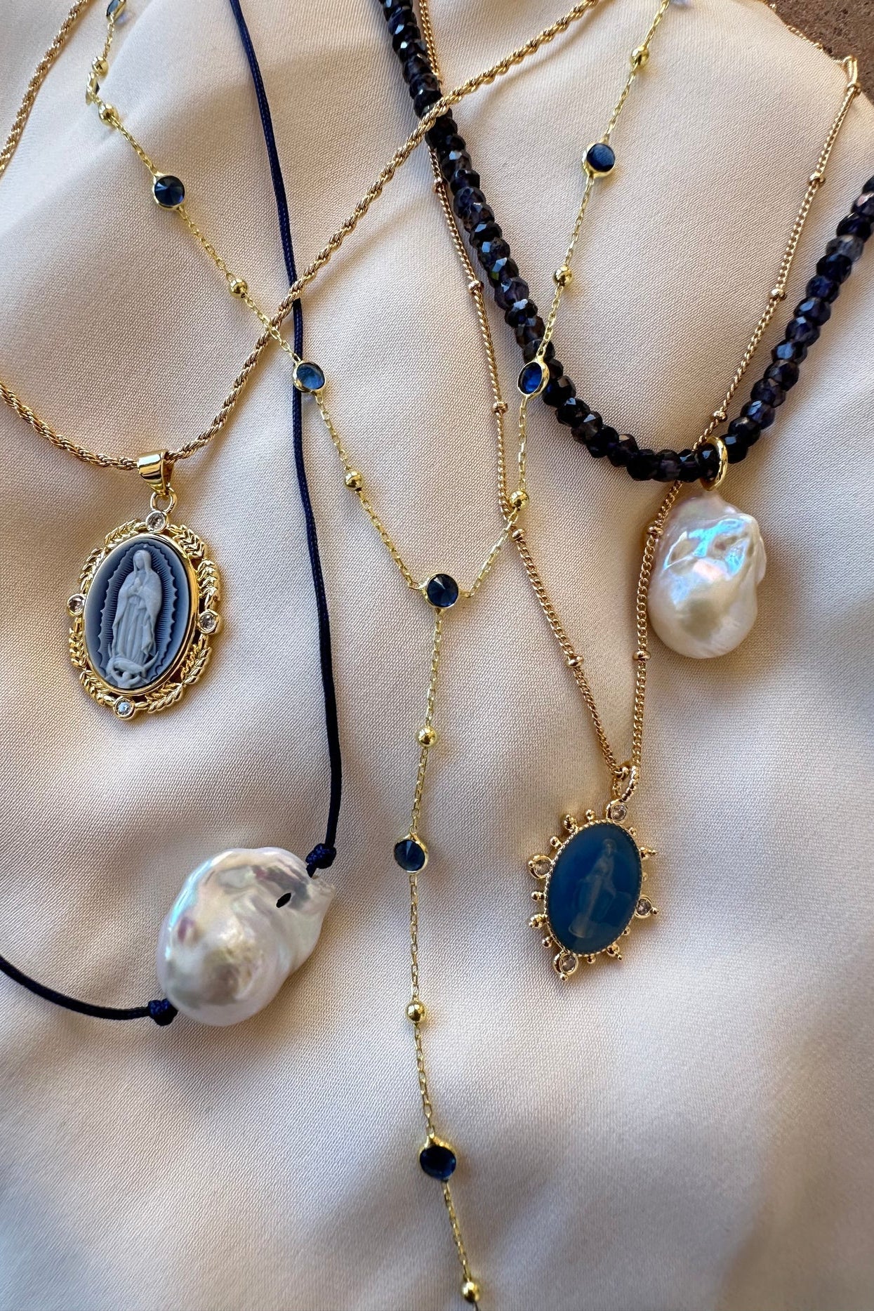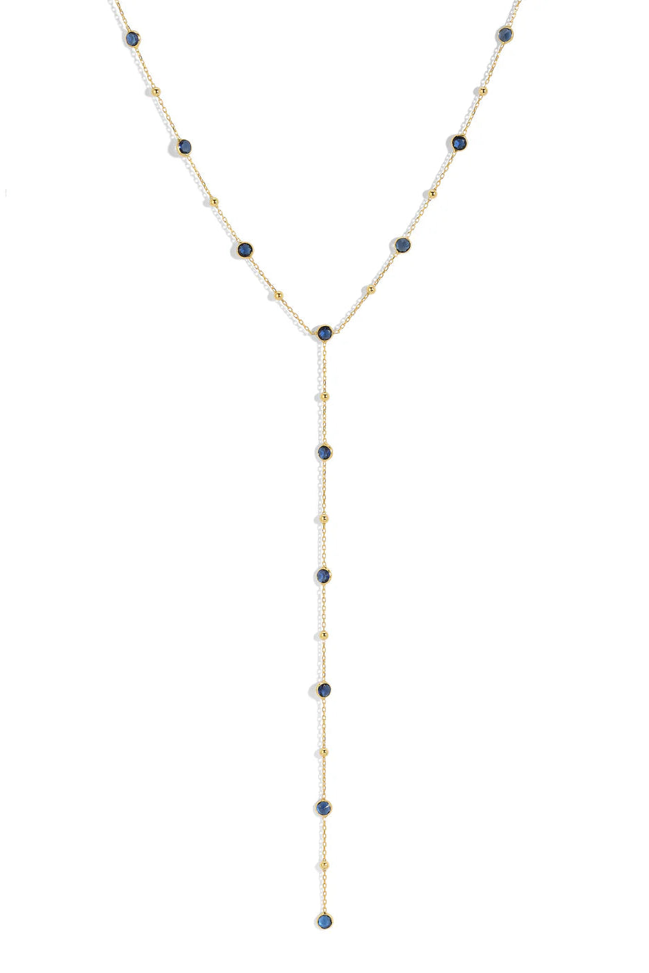 Classic meets bold with the sapphire bezel gemstone lariat necklace. Deep blue stones shimmer along a sleek gold chain, creating a look that’s both timeless and striking. The drop silhouette adds subtle drama, perfect for elevating any outfit from day to night. A modern heirloom piece designed to dazzle for years to come.