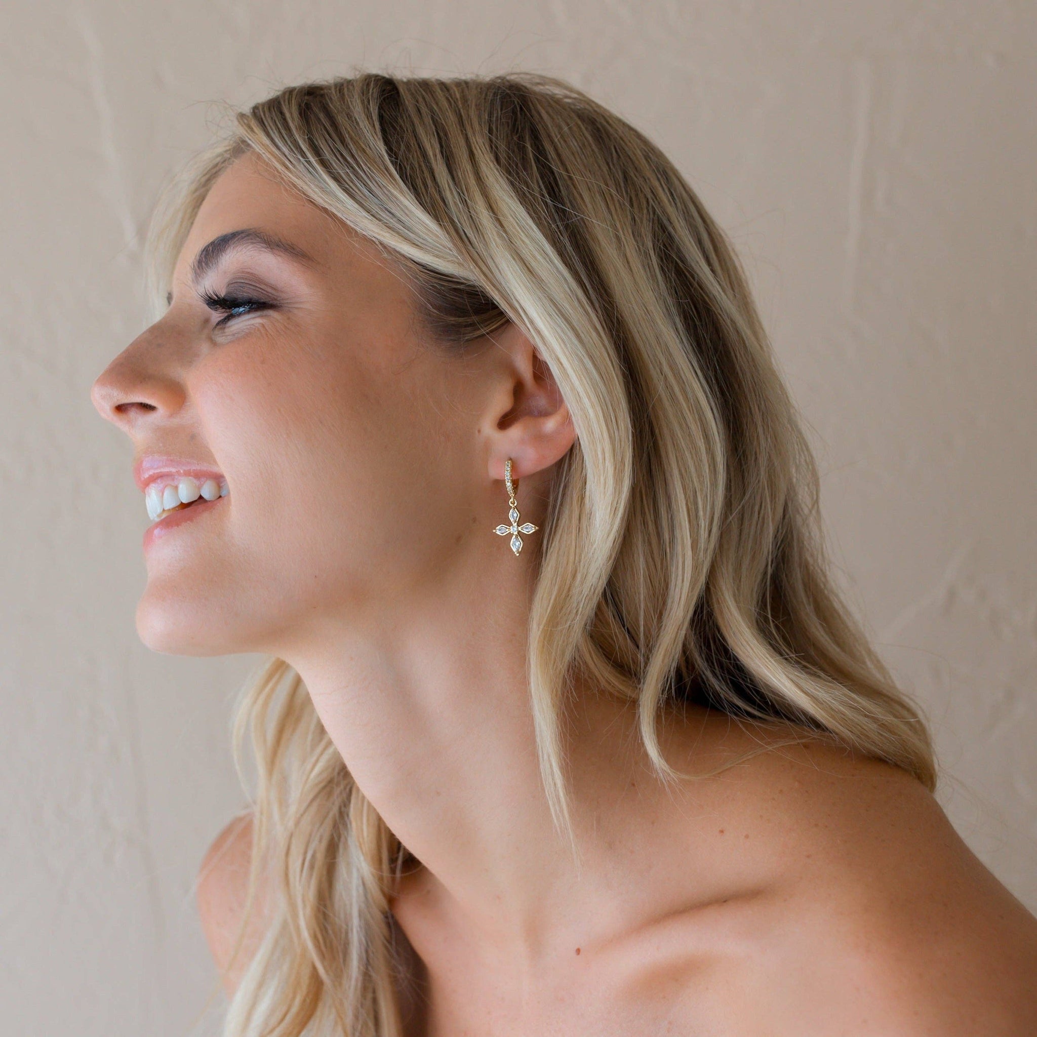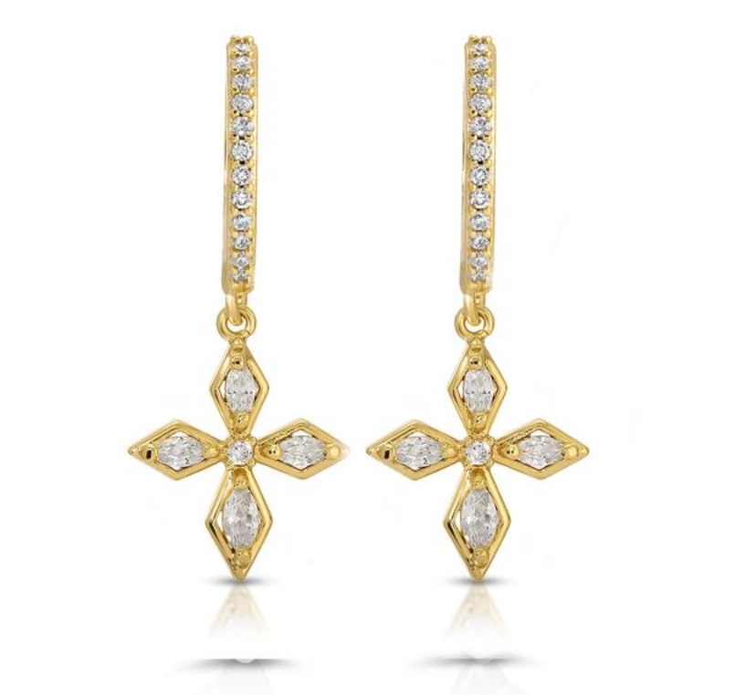 Stunning cross charms hang from Dainty CZ hoops. This is a Handmade Item - Please allow for a 2-7 business day processing time period for our Design Team to make this before Shipment!