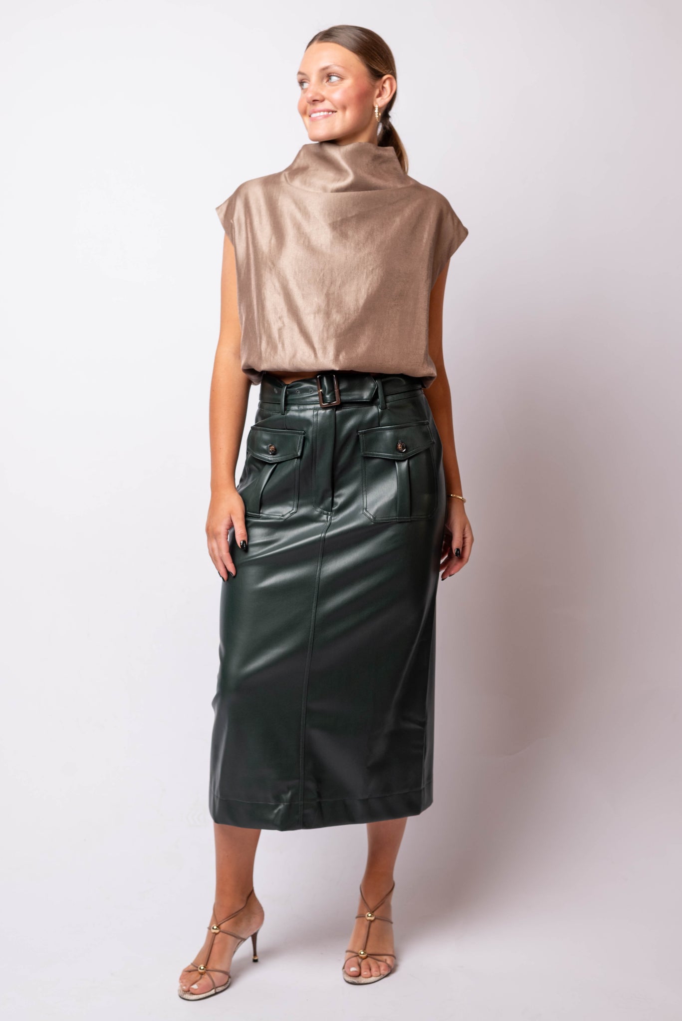 The Astrid Skirt is where modern edge meets timeless polish. Crafted from sleek faux leather, this structured midi skirt delivers a sharp silhouette that feels bold yet versatile. Its clean lines and tailored design make it an effortless statement piece, perfect for dressing up or down with confidence.