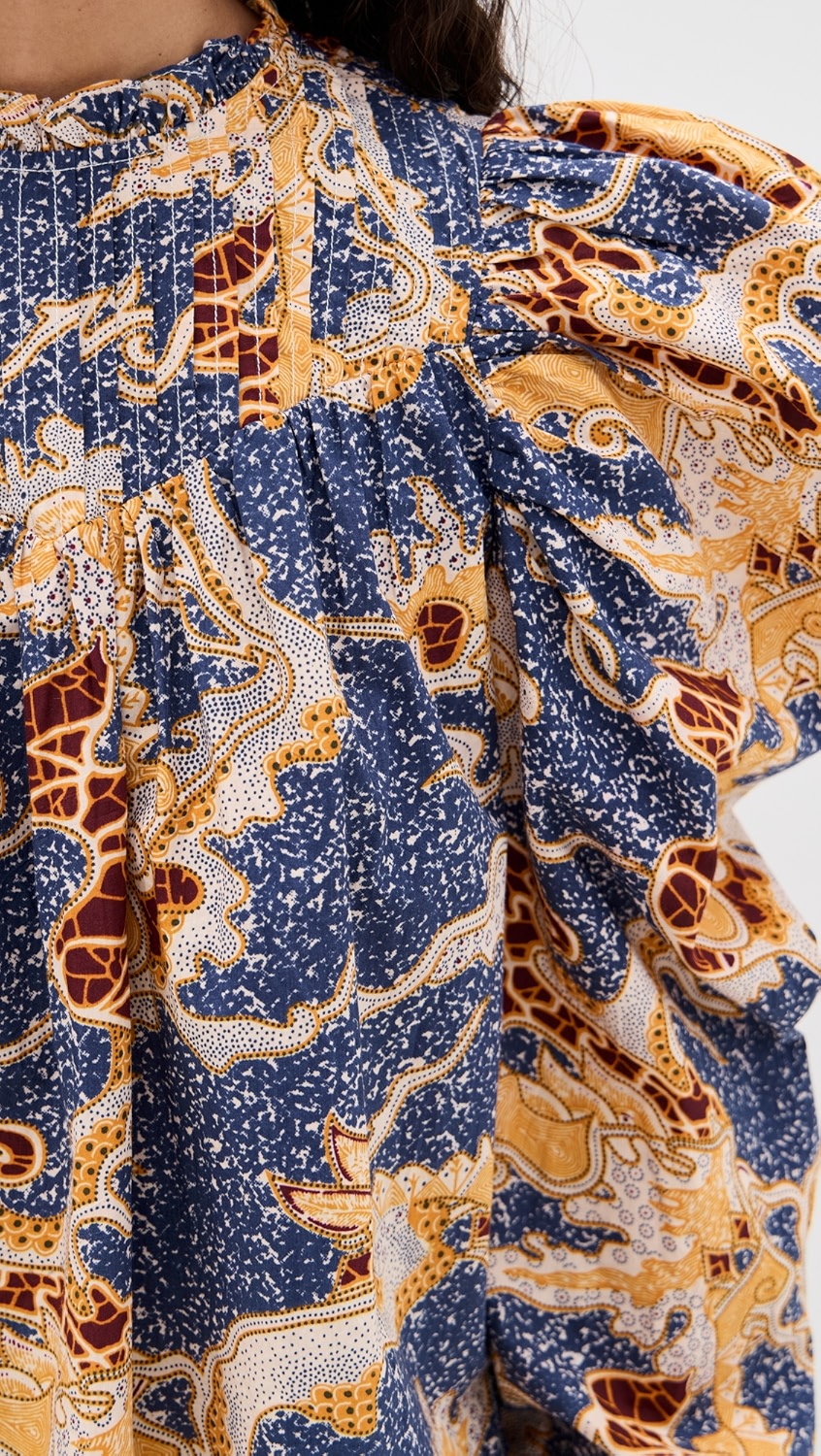 Ethically handmade in India from 100% GOTS certified organic cotton poplin, the Irina Blouse in the Blue Castello print blends effortless comfort with elevated style. This flowy top features a delicate mini ruffled neckline and voluminous bishop sleeves with smocked cuffs—perfect for pairing with denim or skirts for a polished, feminine look.