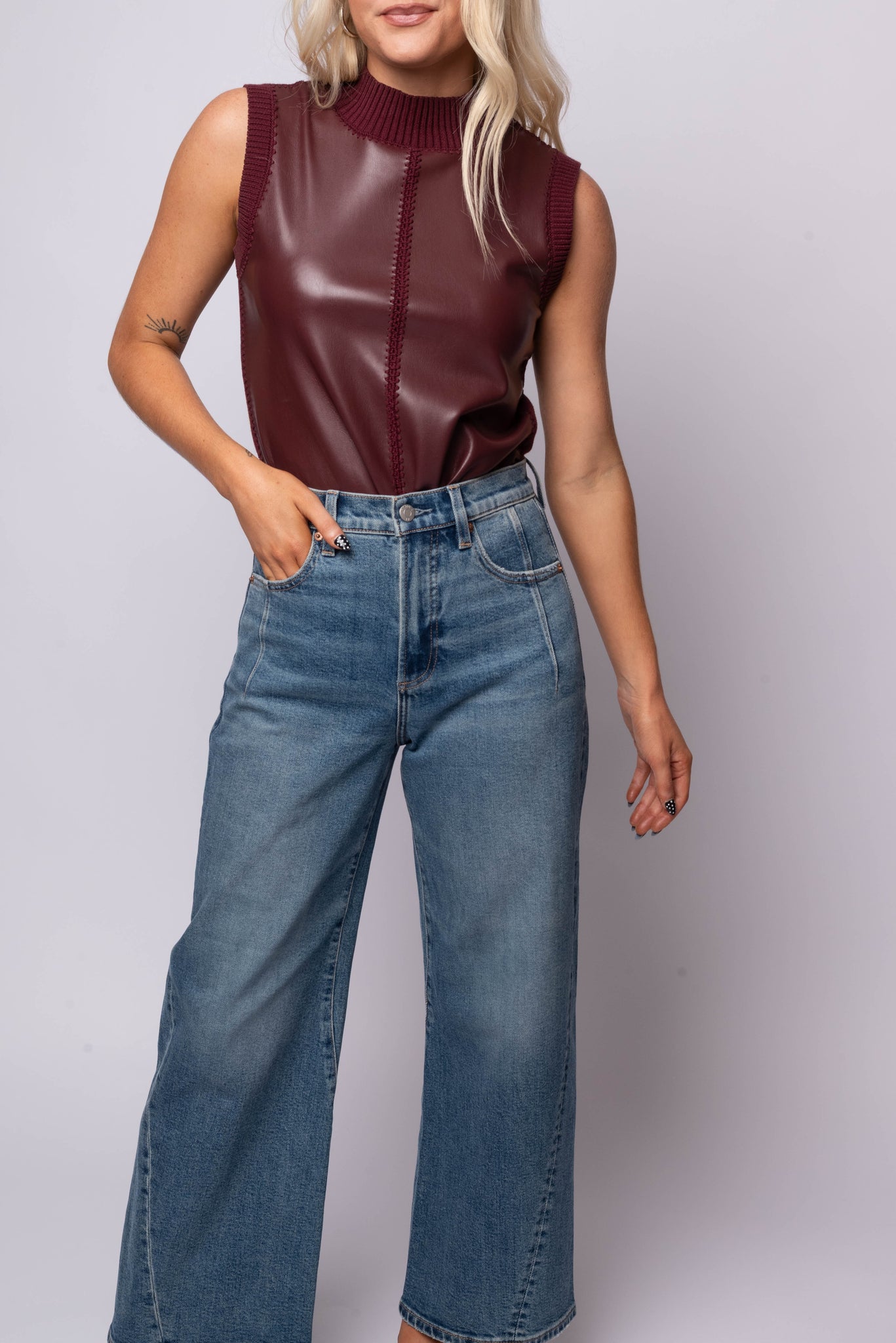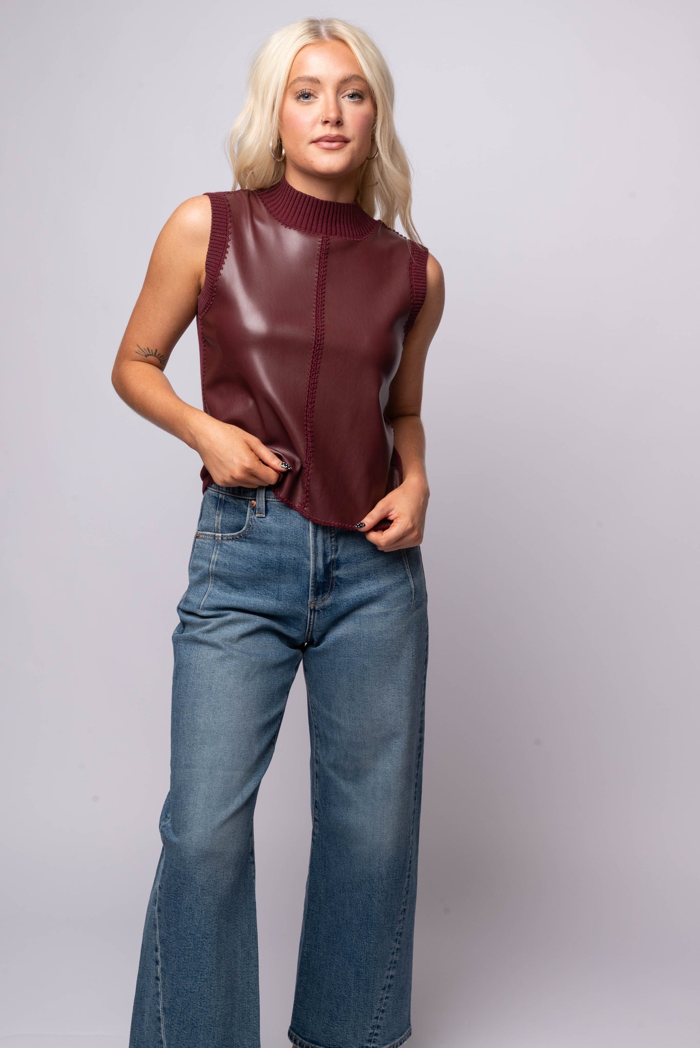 The Nico Top is where sleek design meets modern edge. Crafted in a bold burgundy shade, this sleeveless top features a striking mix of textures with smooth faux leather panels contrasted by ribbed knit trim along the collar and arms. Its structured shape and slightly boxy fit create a flattering, contemporary drape that feels both elevated and wearable.