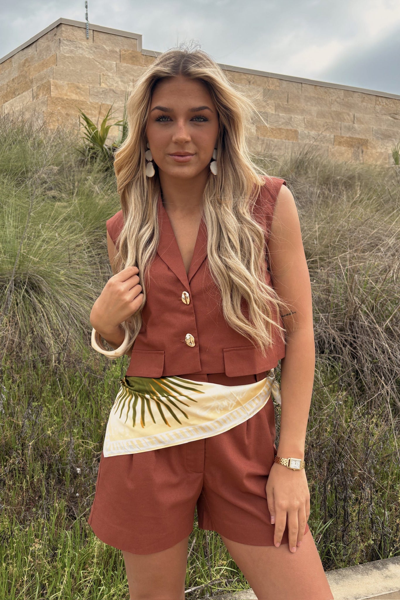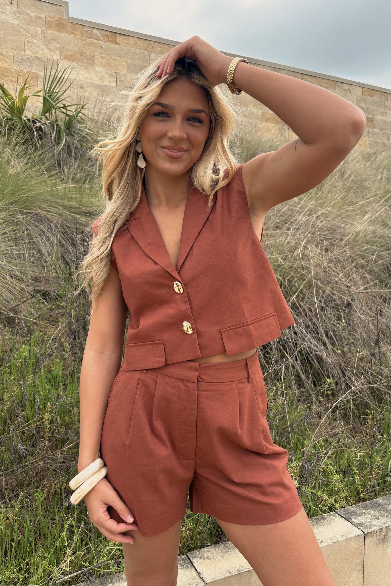 The Venture On is a chic button-up vest and shorts set made for effortless warm-weather dressing. Crafted in a cotton-linen blend, the sleeveless collared vest features a V-neckline, functional button closure, and full lining for a polished, structured finish. Pair it with the matching shorts for a coordinated look that takes you from brunch to a night out with ease. In a rich brick colorway, this set brings warmth and versatility to your spring and summer wardrobe.