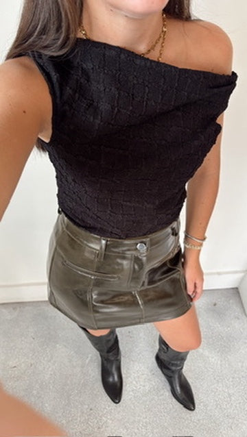 This vinyl faux leather skirt brings a shiny edge to your wardrobe with its sleek look and practical front pockets. Featuring a hidden front zipper, press button, and belt loops, it’s both stylish and convenient. Made from durable, eco-friendly material, the Verne Skirt offers a cool vibe without the fuss.