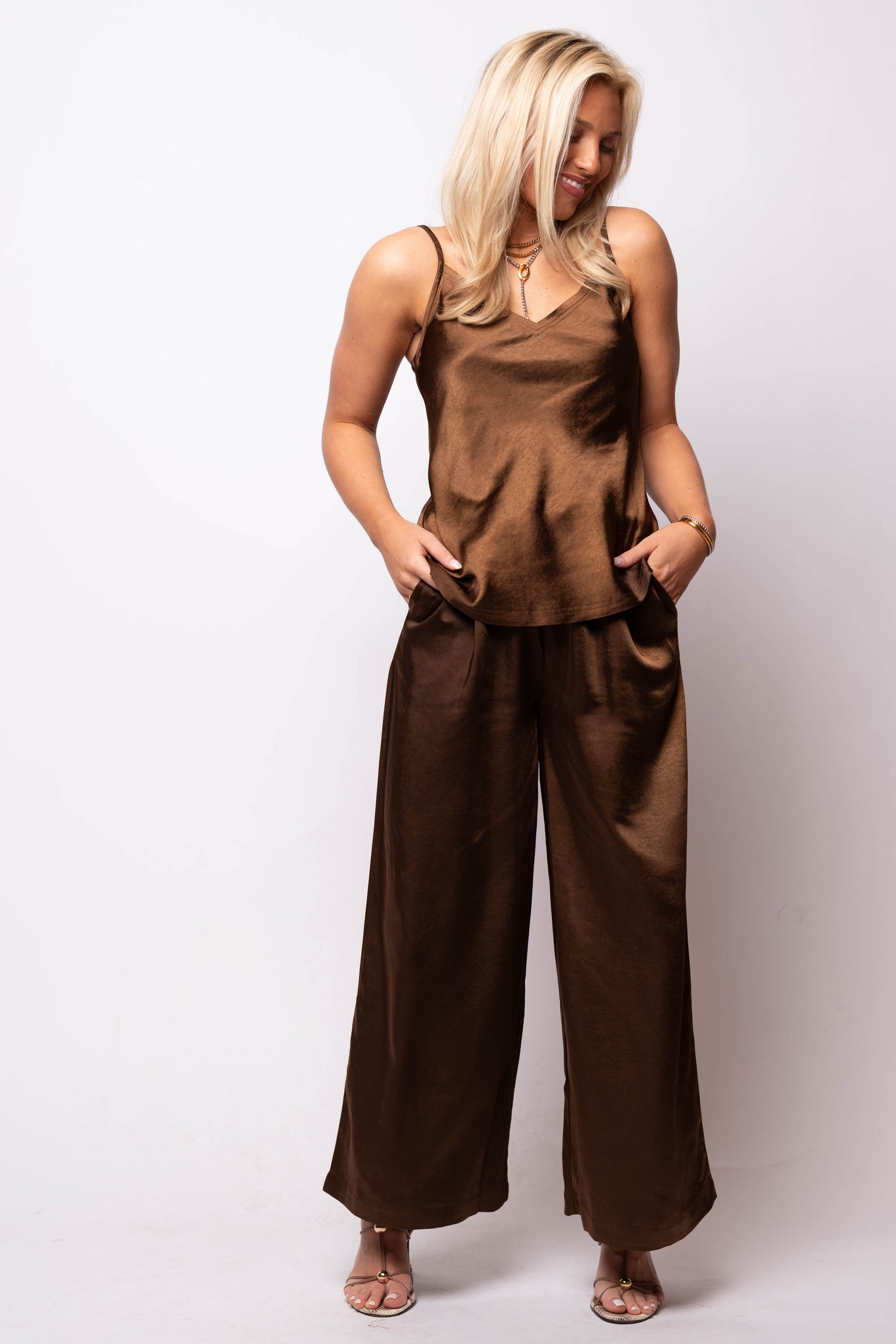 Slip into effortless sophistication with these wide-leg satin pants. The banding waist offers a comfortable, flexible fit that moves with you, while the luxe satin fabric drapes beautifully for an elevated silhouette. Rich dark brown pairs with everything in your wardrobe—dress them up for nights out or keep it casual with a simple tee. A timeless piece that feels as good as it looks.