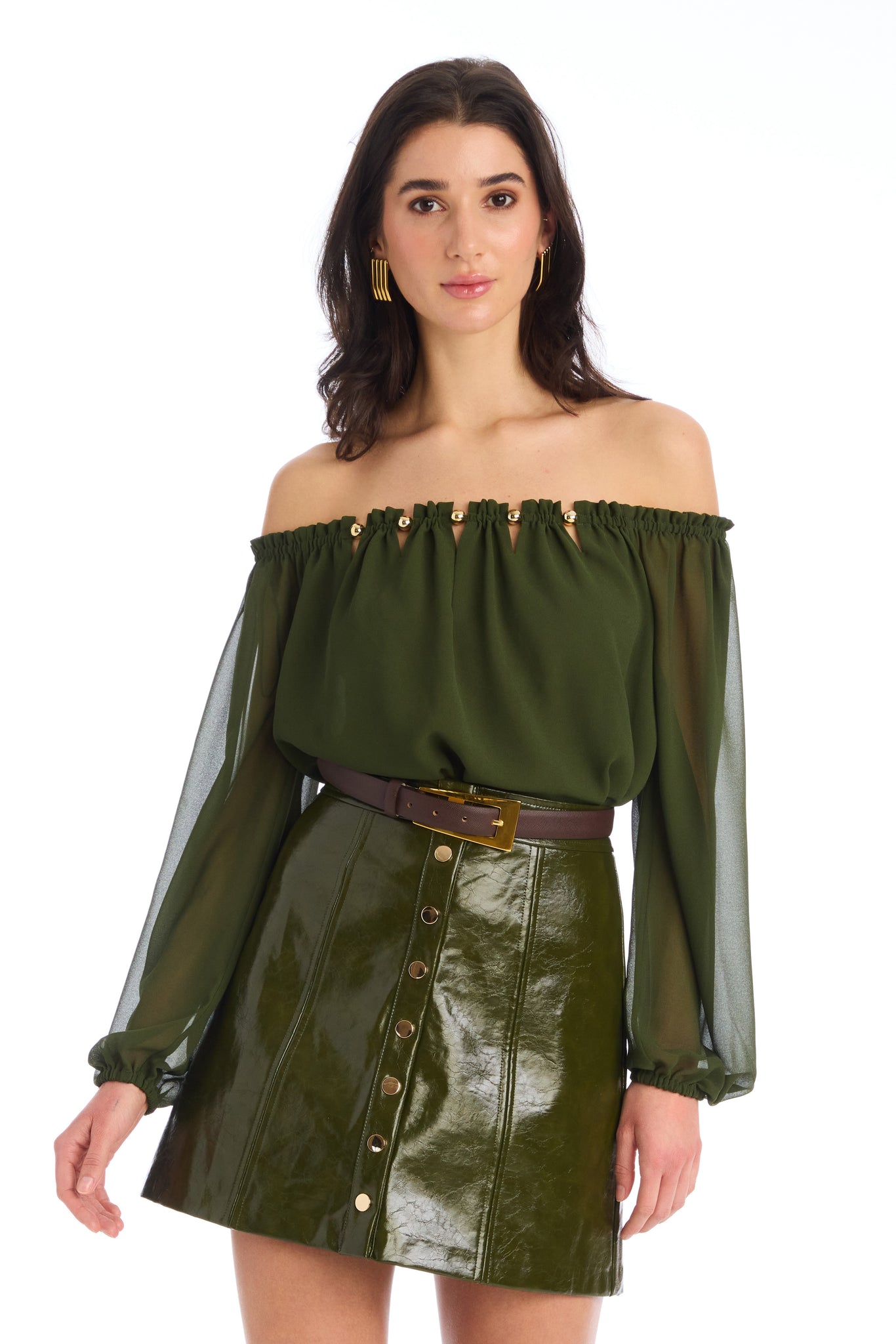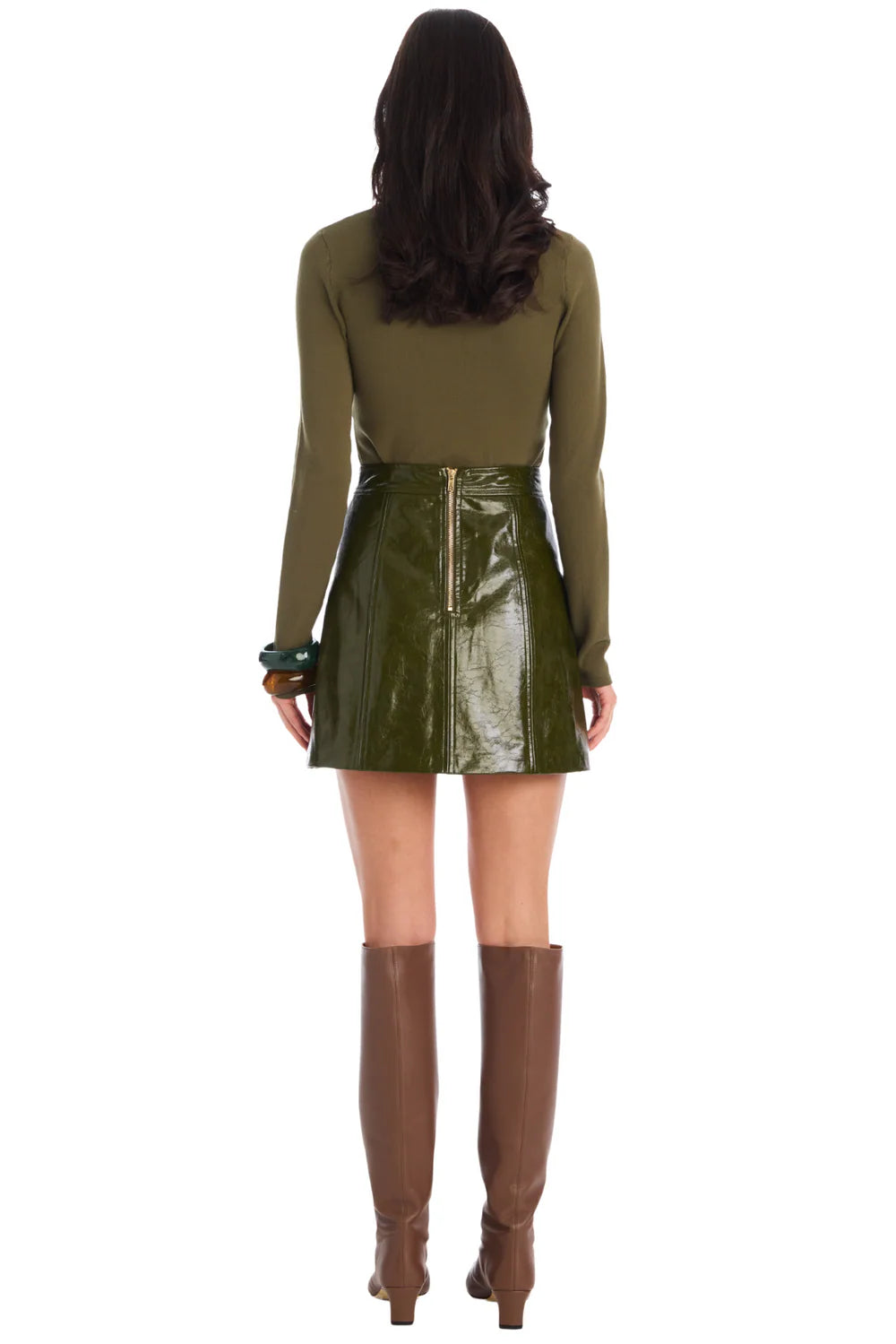 The Carla Skirt features a shiny faux leather with gold buttons down the center front. Fitted through the waist and high hip with an A line shape. Fully lined with a center back zipper closure in gold.