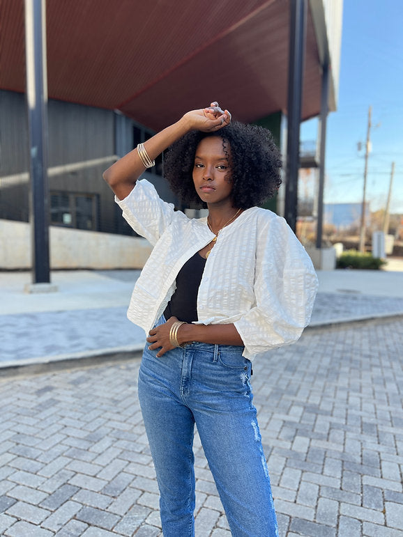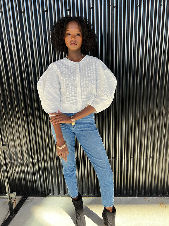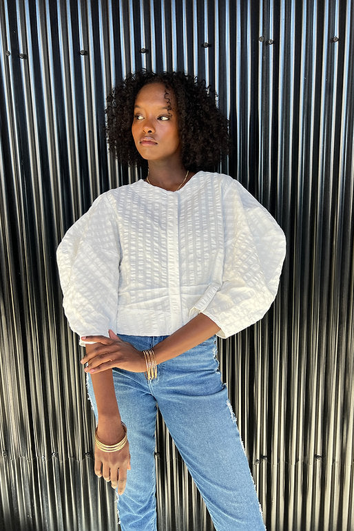 The Morant 2 Top effortlessly steals the spotlight with its sculptural sleeves and subtle striped cotton fabric. Its cropped, boxy shape blends modern edge with timeless style, making it a perfect go-to for an easy, polished look. Lightweight and structured, this top adds a fresh twist to any outfit without trying too hard.