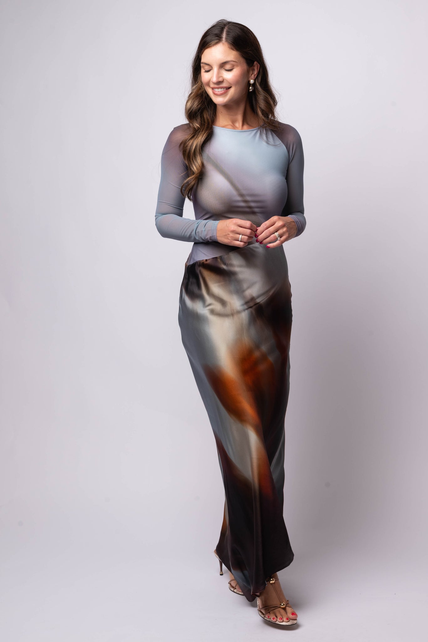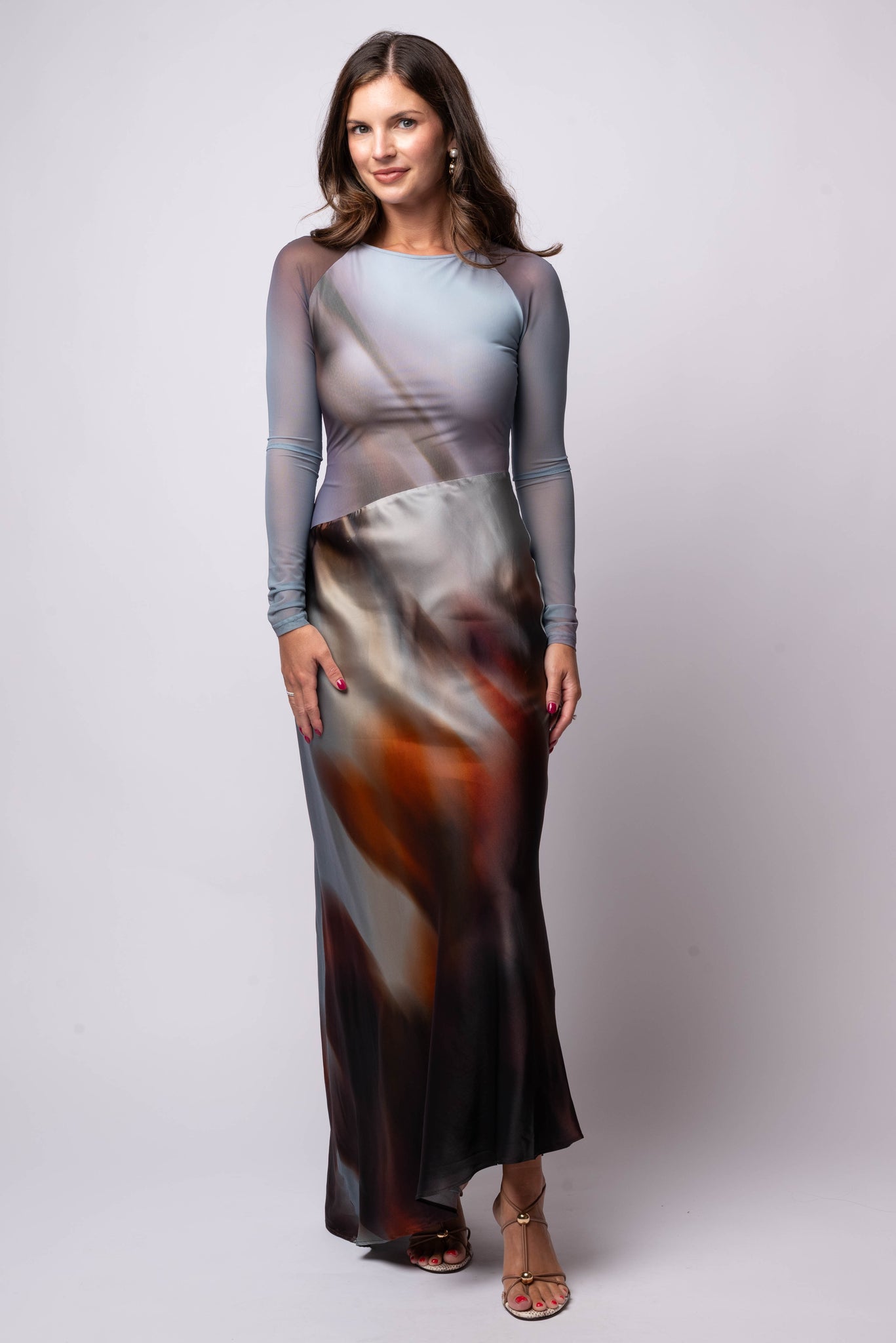 The Sofiya Maxi Dress by Significant Other is designed in a striking placement print with a modern, fluid silhouette. Featuring a sheer stretch bodice with long sleeves, an asymmetrical hemline, and a georgette-lined skirt for added movement. Finished with a center back invisible zipper for a sleek fit.